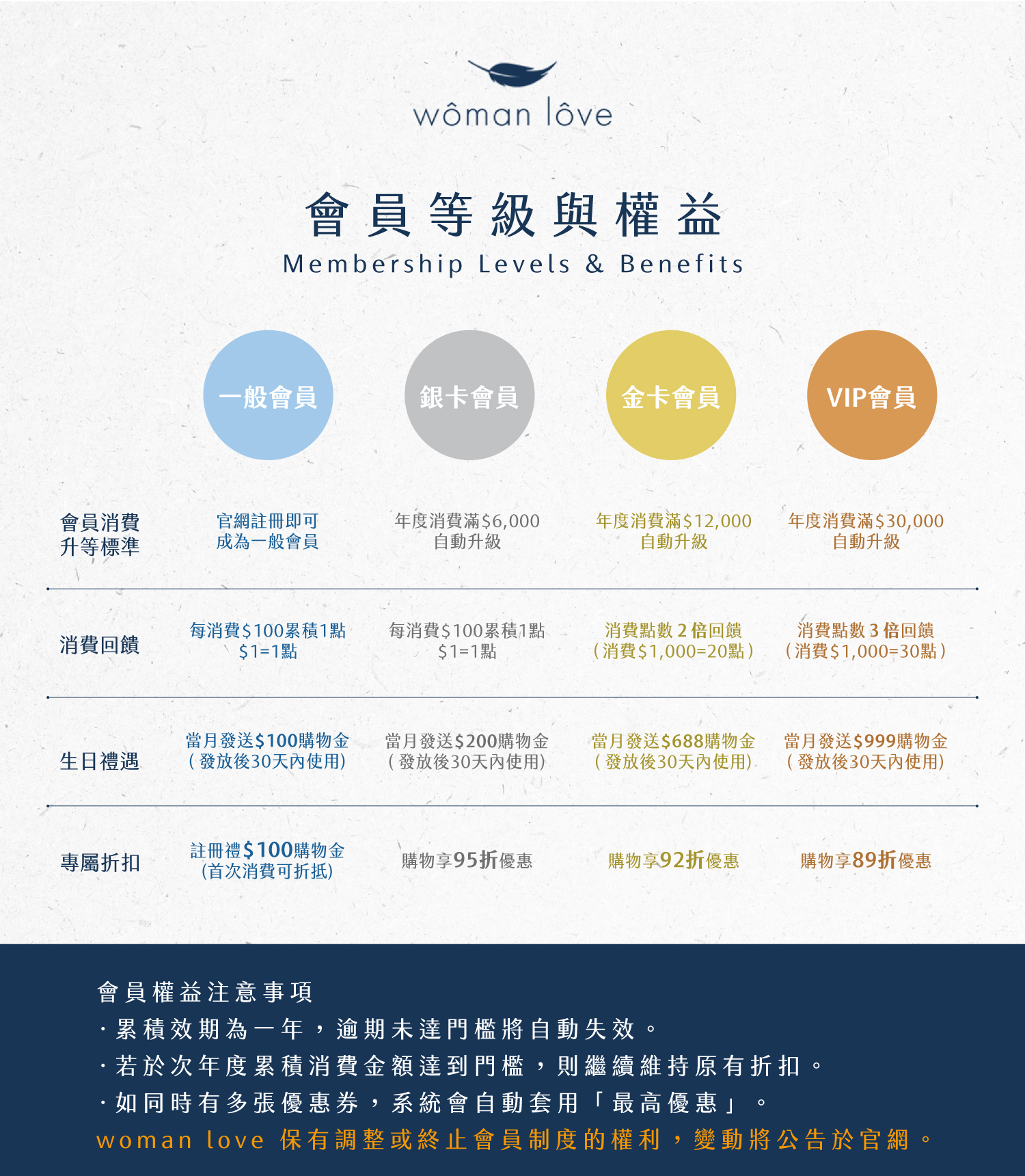 woman love 保留 調整或終止會員制度 的權利,任何變動將公告於官網